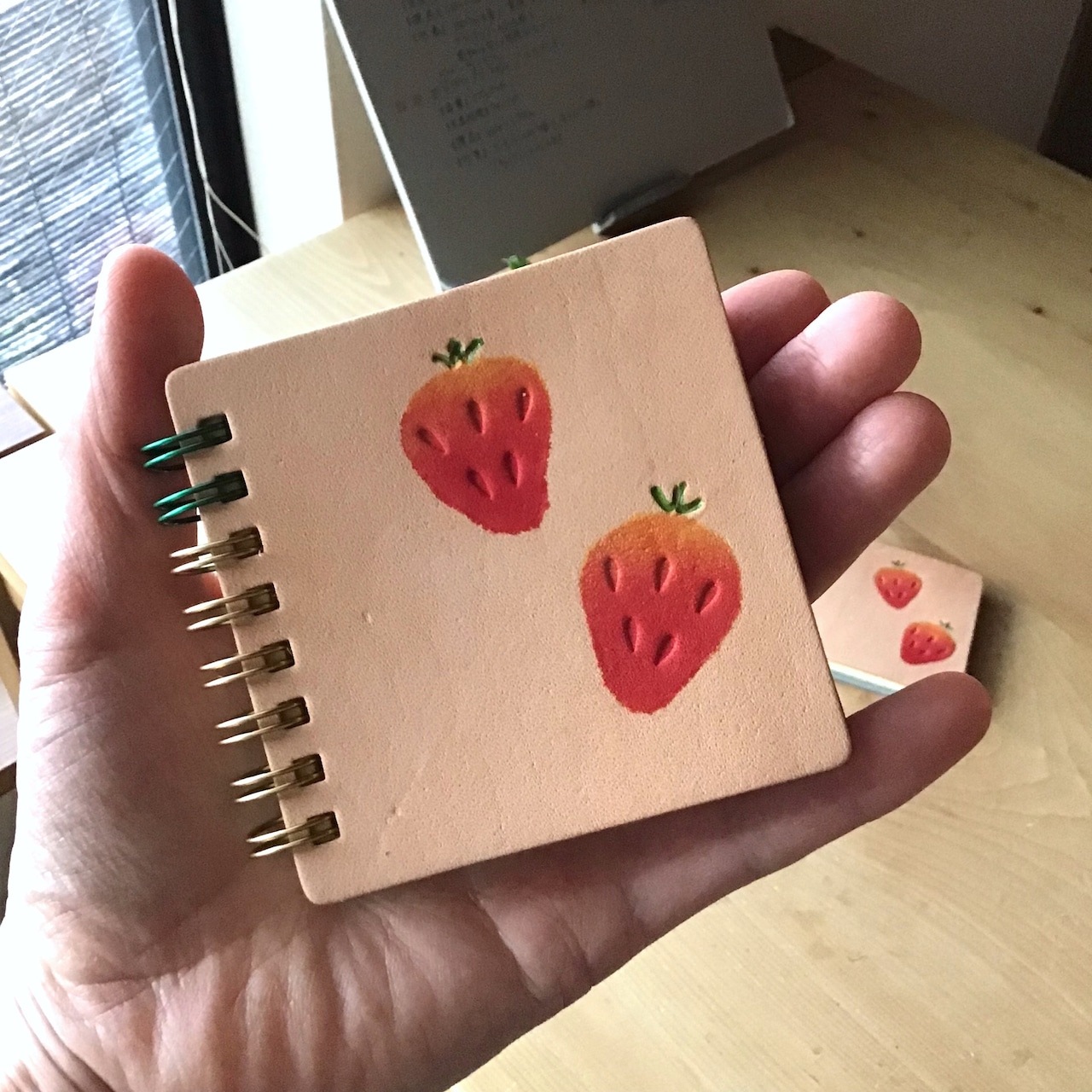 手のひらメモ【型染めイチゴ】は、絵本に登場しそうな可愛らしいイチゴをモチーフにした手のひらサイズのメモ帳です。